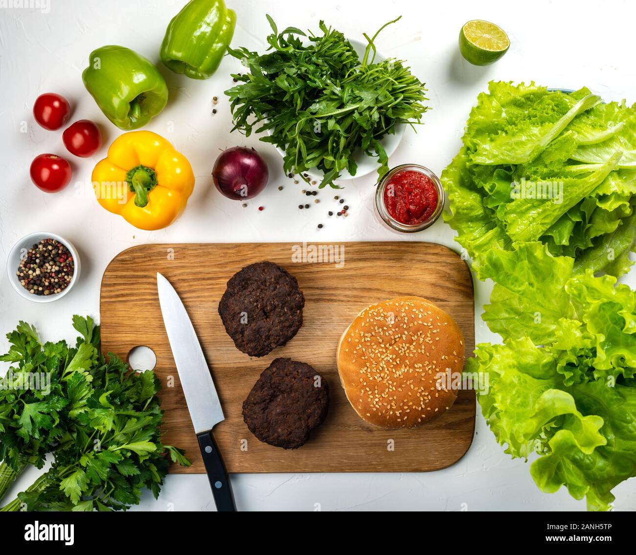 Making Delicious Burger On A Wooden Kitchen Table Top View Stock