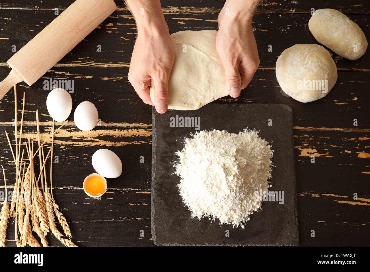 Man Making Dough On Kitchen Table Top View Stock Photo 256544144
