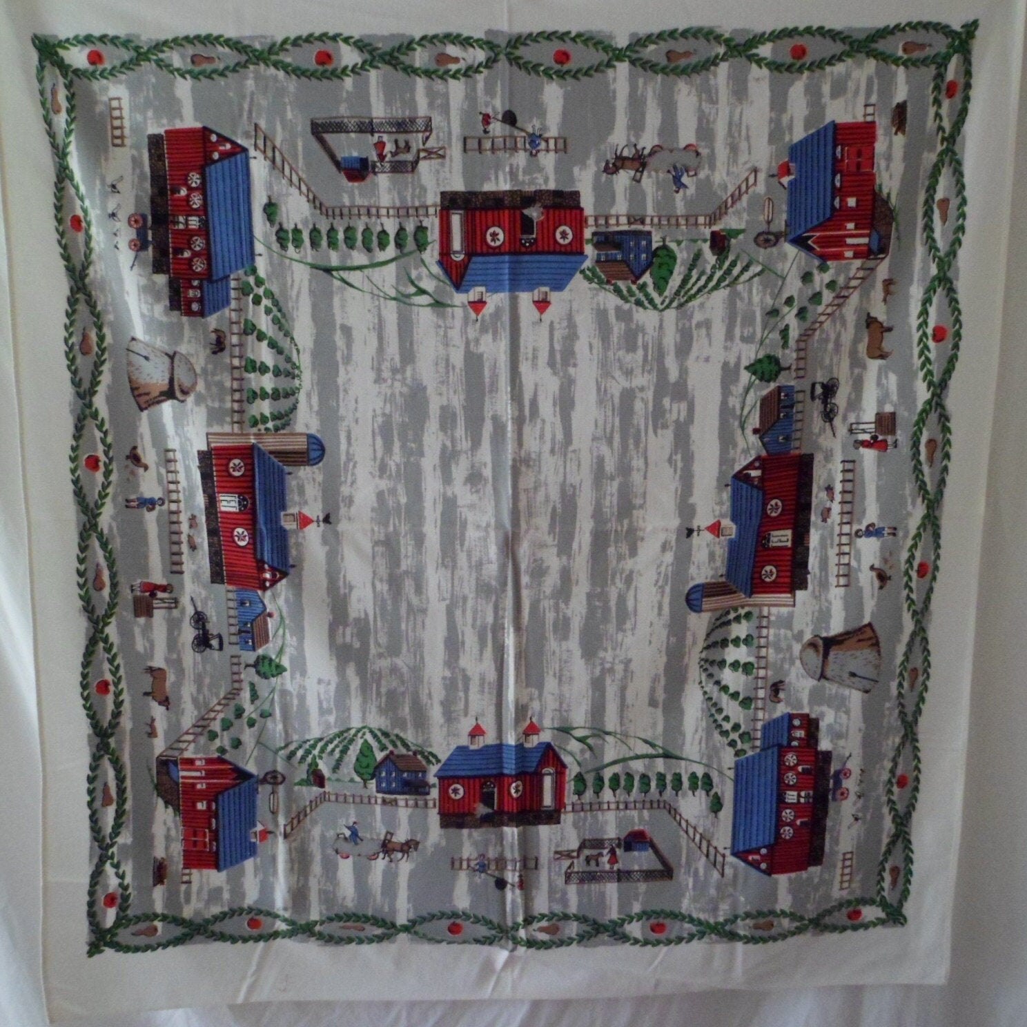 Vintage Kitchen Tablecloth Farm Scene Barns Wagons Animals Etsy