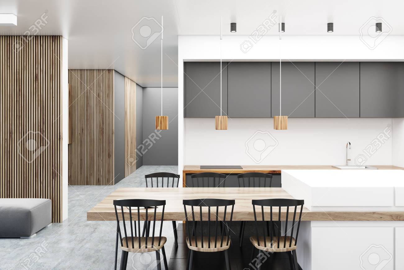 White And Wooden Kitchen With A Gray Bar A Long Table With Chairs