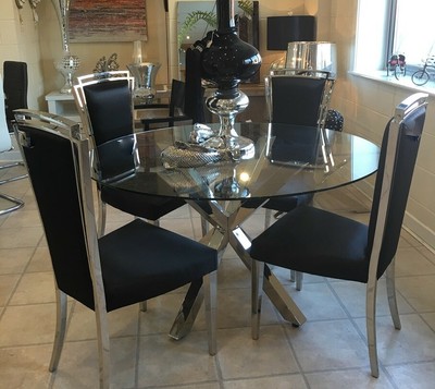 Crosby Modern Round Glass Chrome Cross Leg Dining Table Kitchen