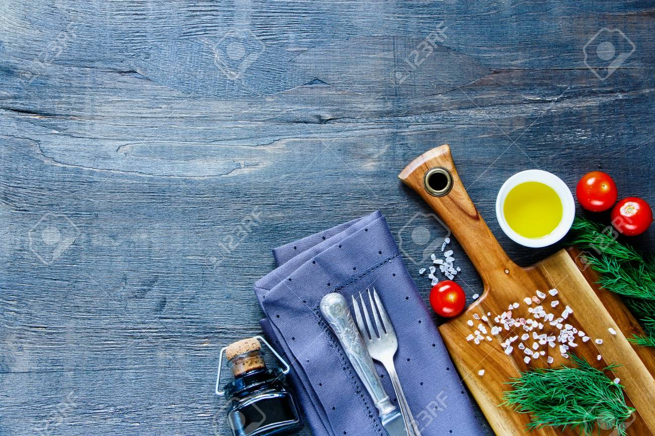Wooden Kitchen Table With Cutting Board And Ingredients On Vintage