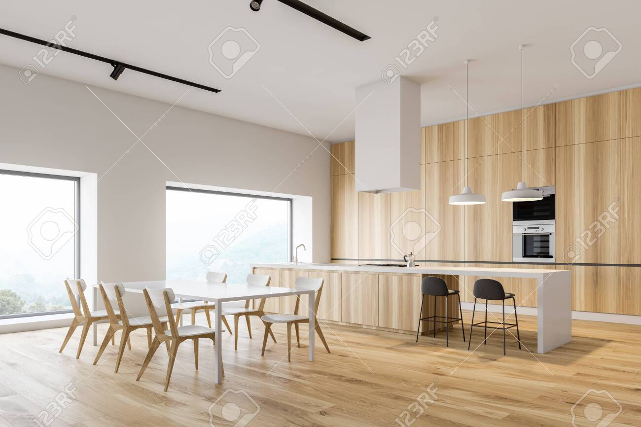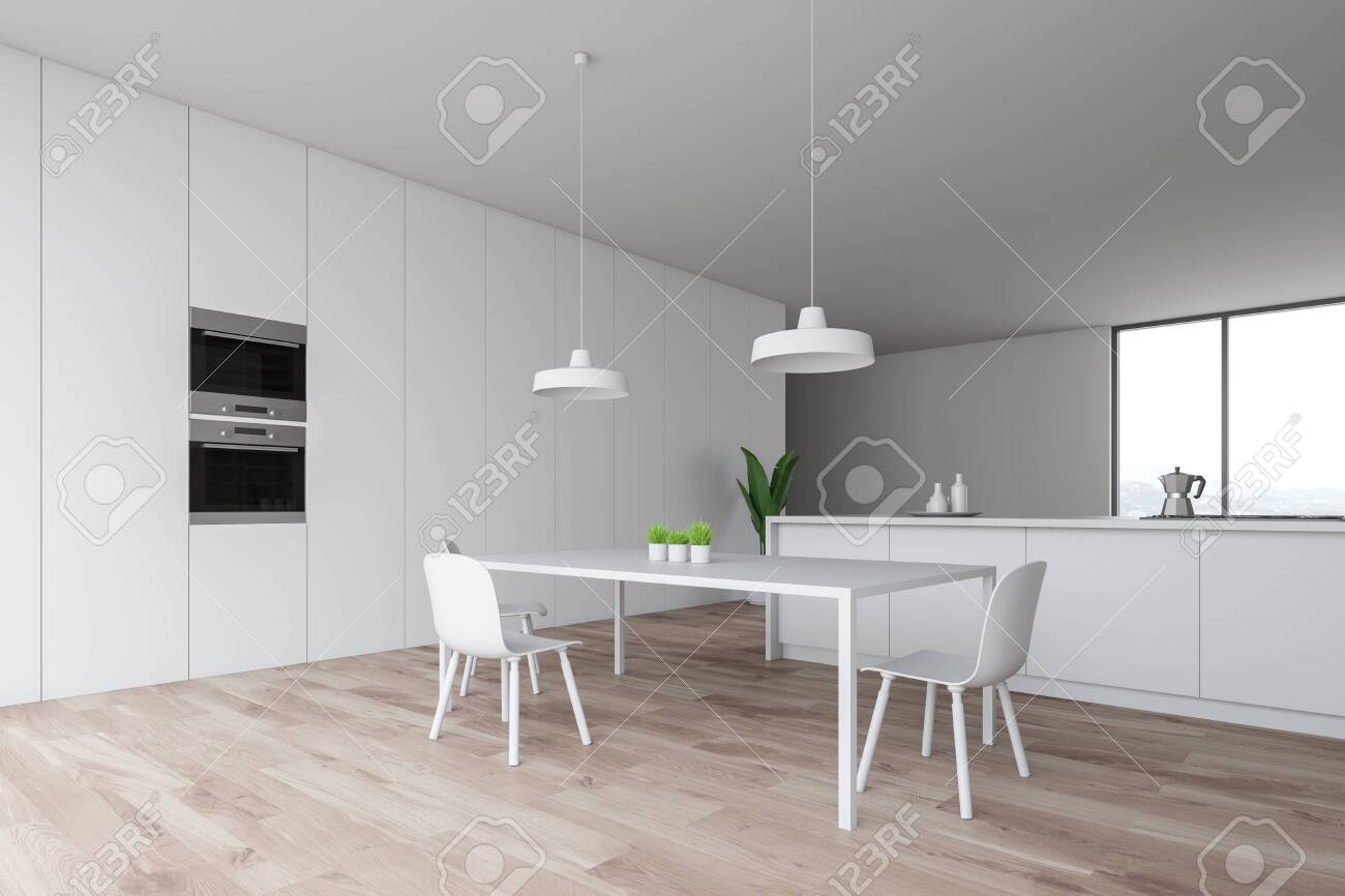 Corner Of Modern Kitchen With White Walls Wooden Floor Wooden