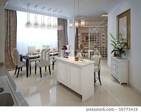 Kitchen With Island And Dining Table In The Arab Stock