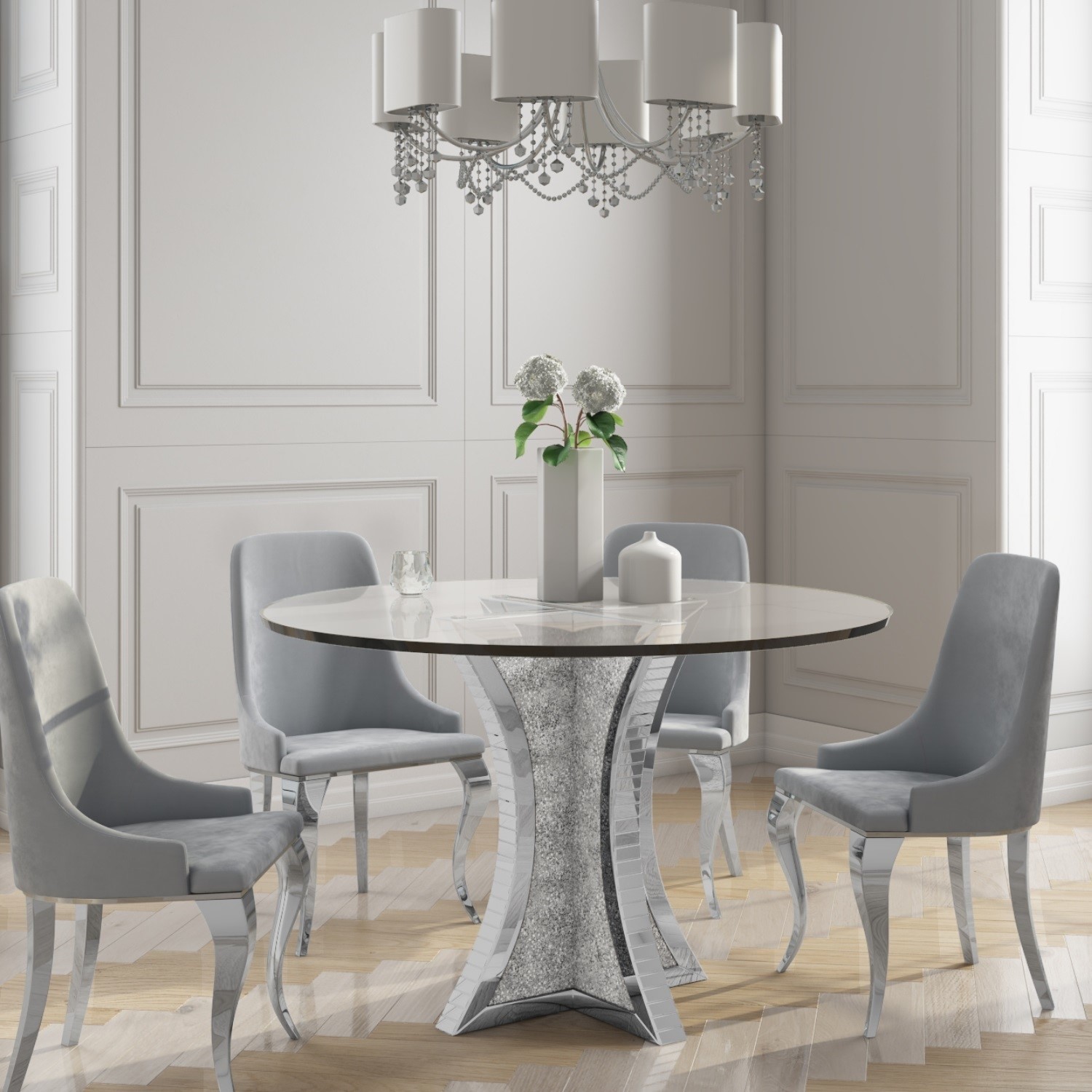 Round Mirrored Dining Table 4 Chairs In Grey Velvet Jade
