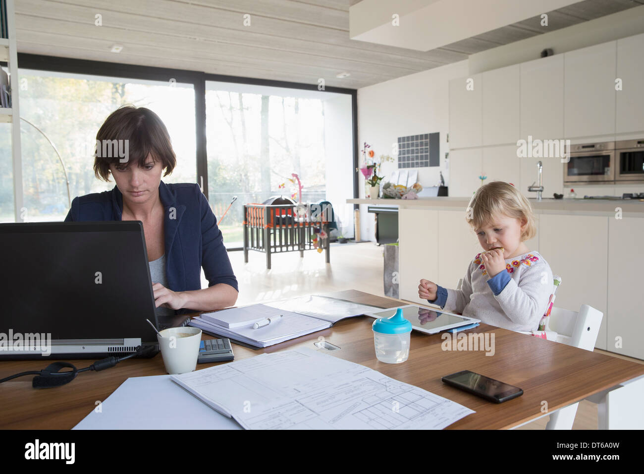 Mother With Female Toddler Working On Computer At Kitchen Table