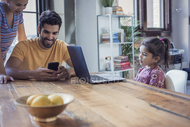 Family At Kitchen Table Man Using Smartphone Toddler Girl